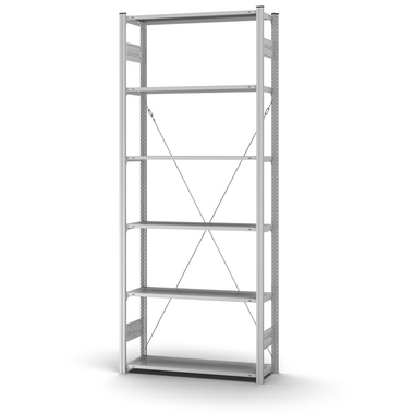 - inkl. Stützprofil, Diagonalstrebe, Verbinderblech, Fußplatte, Kunststoffkappe, Spannschloss, Sicherungsstift, Fachbodenträger, Fachboden